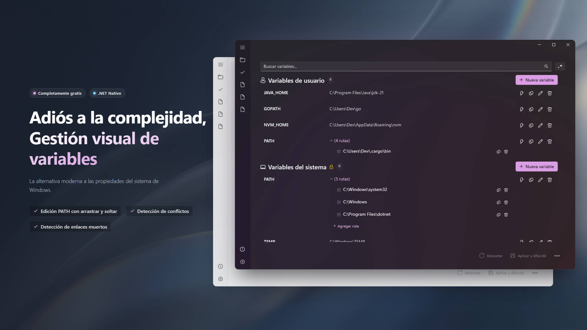 Ese cuadro de diálogo apenas ha cambiado en 20 años. Funciona, pero poco más. EnvStudio aspira más alto: hacer que la gestión de variables de entorno no sea algo para lo que necesites armarte de paciencia.