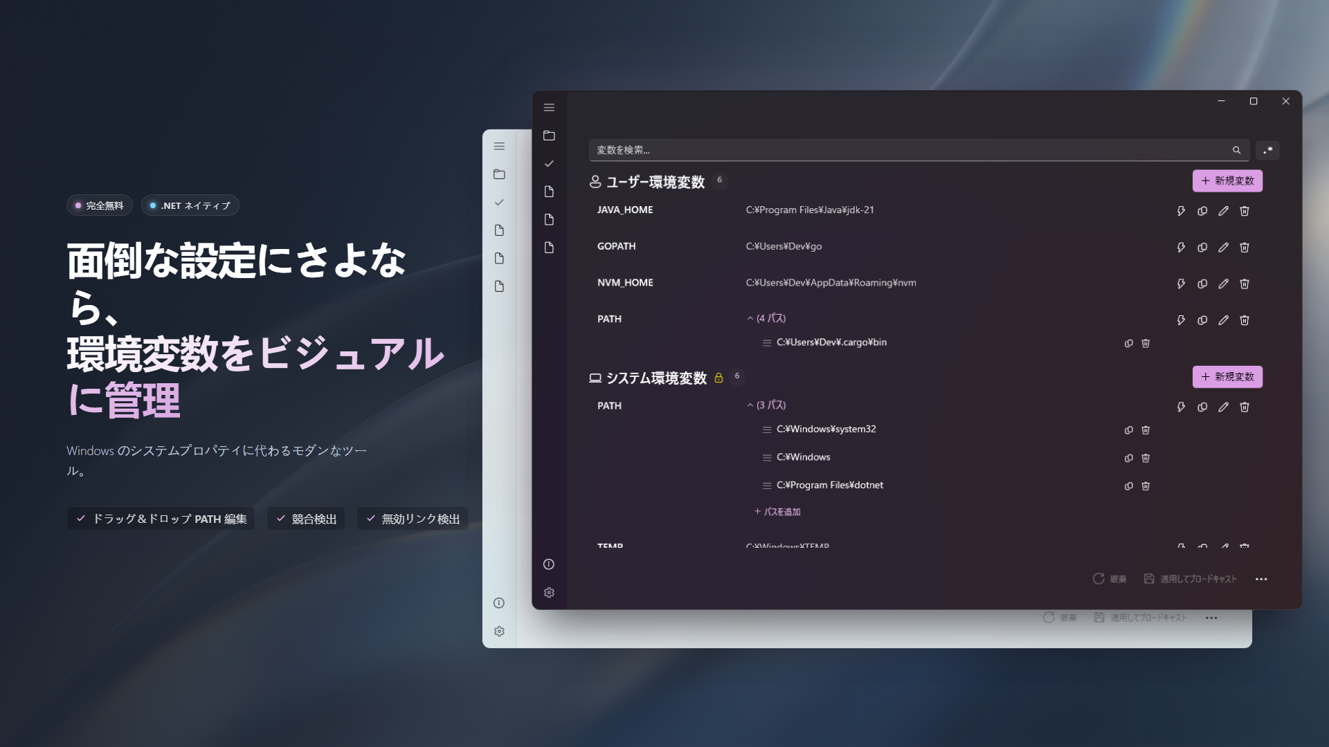- デッドリンク検出:アンインストール後に PATH に残ったディレクトリが自動的に赤くハイライトされ、整理を促します。