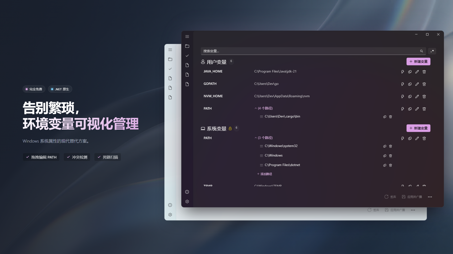 当你的用户变量和系统变量有同名的键时(比如用户设了一个 TEMP,系统也有一个 TEMP),系统变量会被用户变量覆盖。但这个"覆盖"在原生编辑器里完全不可见。你不知道它被覆盖了,你甚至不知道它存在过。